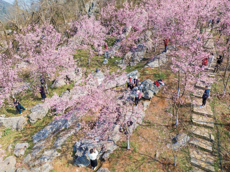 14日,西塞山區(qū)飛云山上,大片櫻花絢爛綻放,吸引不少市民踏青賞花,拍照留念。